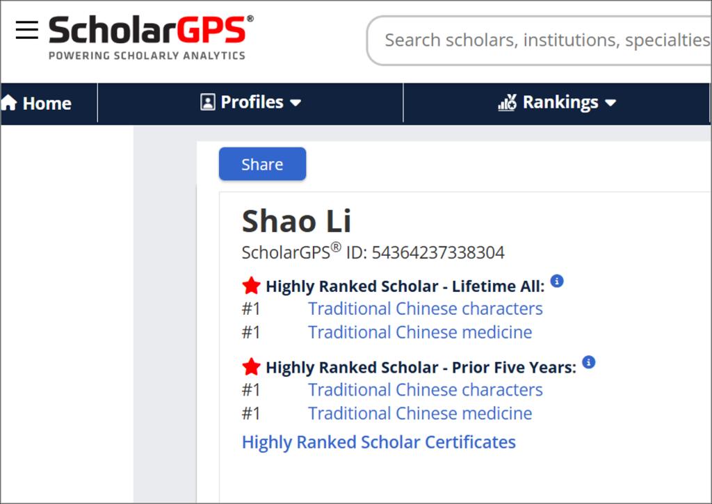 清华大学长聘教授、北京市中医药交叉研究所所长、欧洲科学与艺术院李梢院士再创佳绩,继2024年后再次入选国际知名学术评价机构ScholarGPS正式发布2025年全球前0.05%顶尖学者榜单,蝉联 “Traditional Chinese characters”和“Traditional Chinese medicine”两大中医药相关专业的终身(Lifetime)学术影响力榜单第一。同时在上述两个专业的近五年(Prior Five Years)学术影响力榜单中也位列全球第一,成为中医药专业双榜双第一。