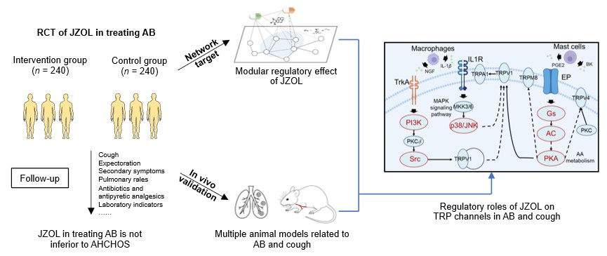 该研究基于网络靶标和动物实验发现金振口服液对急性支气管炎咳嗽症状的关键调节机制及靶点,表明金振口服液在治疗儿童急性支气管炎的临床疗效非劣于止咳化痰临床一线化药。该研究为临床治疗儿童急性支气管炎提供了新方案,并为临床-计算-实验联合研究提供了范例。